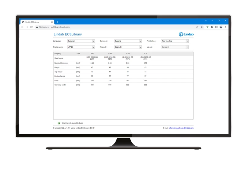 See veebirakendus sisaldab sektsioonide andmeid ja geomeetriat meie lehtmetalli-, C-, Z-, U- ja mütsiprofiilide portfellide jaoks. Väärtused on arvutatud vastavalt Eurocode'ile ja on saadaval valitud Euroopa riikides.