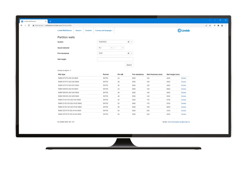 Rakendus, mida saab kasutada, kui otsite seina, millel on teatud nõuded heli, tule, seina kõrguse jms osas. Määrake oma seina jaoks asjakohased kriteeriumid ja saadaolevad nõuetele vastavad seinakonfiguratsioonid esitatakse tabelis.